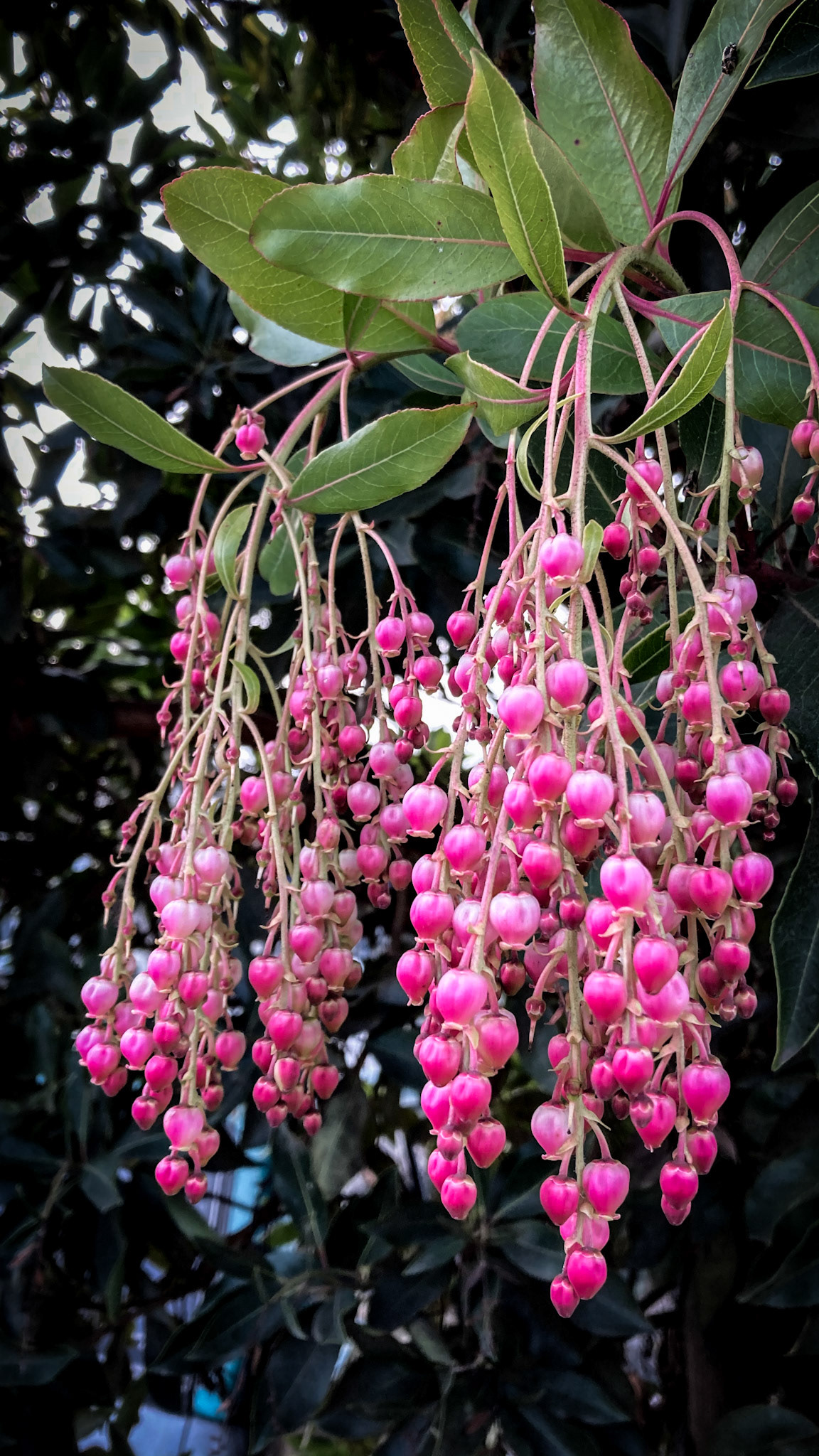 a cluster of hanging flowers against a wooden fence